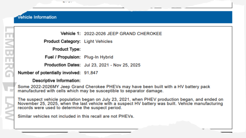 That led me to look more closely at the recall itself. On October 30, 2025, Chrysler submitted NHTSA Recall No. 25V741, a federal safety recall involving certain Jeep Grand Cherokee plug-in hybrid vehicles. According to the National Highway Traffic Safety Administration filing, the recall involves a potential defect in the high-voltage battery pack, where some battery cells may be susceptible to internal separator damage